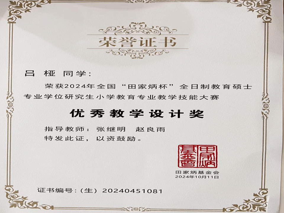 近日,2024年全国“田家炳杯”全日制教育硕士专业学位研究生“小学教育”、“特殊教育”领域教学技能大赛相继落下帷幕,威尼斯9499登录入口乔福强副教授指导的特殊教育专业研究生董婉晴、侯艳分别荣获全国一等奖、三等奖,张继明副教授指导的小学教育专业研究生吕桠获得“优秀教学设计奖”,乔福强老师获得“优秀指导教师”,学院代表威尼斯9499登录入口取得了优异成绩。