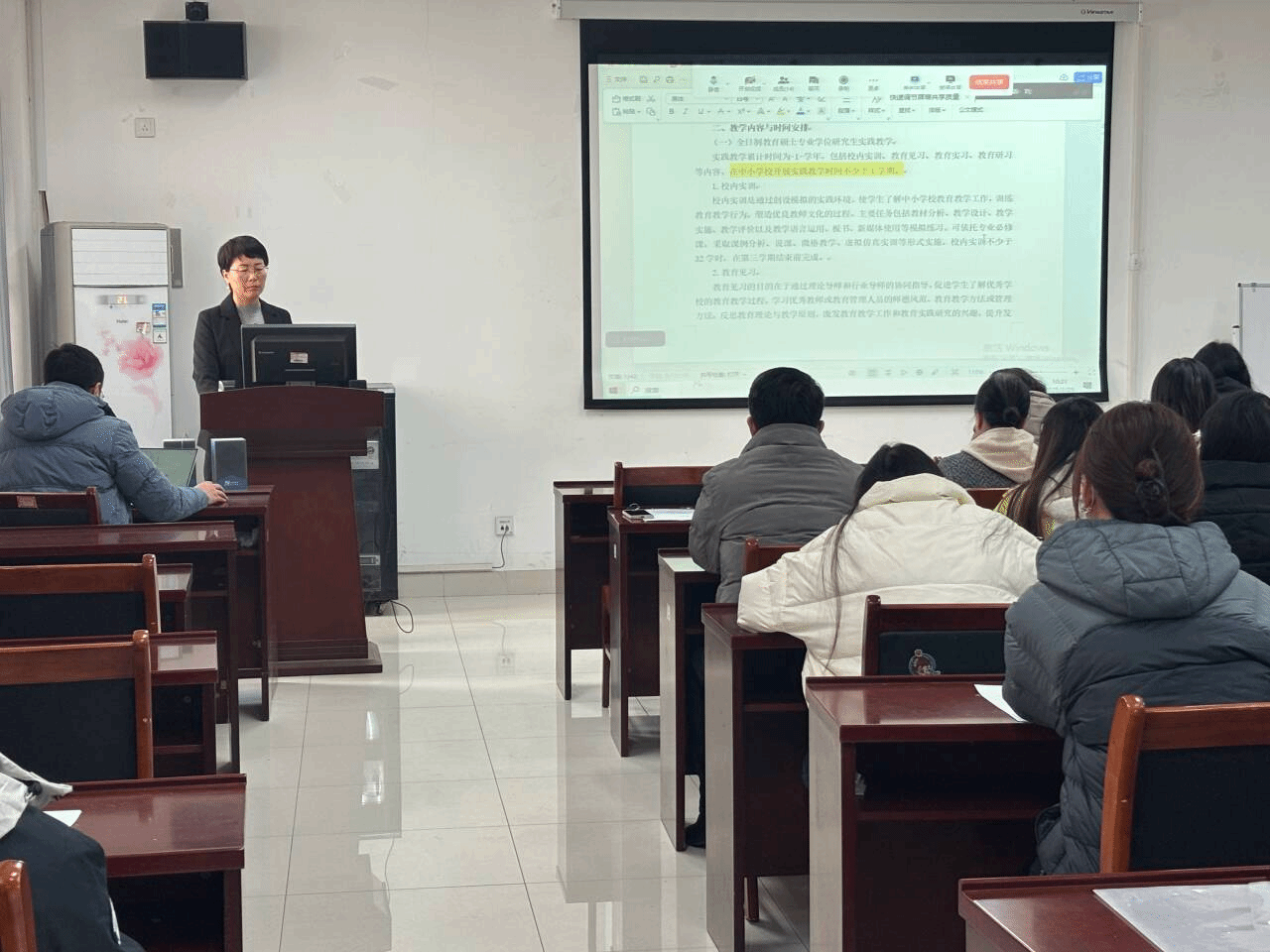 2023级教育硕士是2022年新的教育硕士培养方案修订后第一级进行教育实习的研究生。魏淑华主任解读了《威尼斯9499登录入口全日制教育硕士专业学位研究生实践教学基本要求》,以心理健康教育领域为例详细讲解了2023级全日制教育硕士专业学位研究生实习任务,分别从实习时间、实习内容、实习材料的撰写、实习步骤、教育实习成果展示等方面布置了实习任务。她指出,教育硕士实习方案包括学科教学实践、班级管理实践、教学研究实践三个部分,要求所有实习研究生必须全程、主动参加所有的教育教学实习活动,按照实习方案,完成不少于16周的实习任务,严格考勤,做好日常实习笔记和周期性实习总结,最终完成教育实习报告。