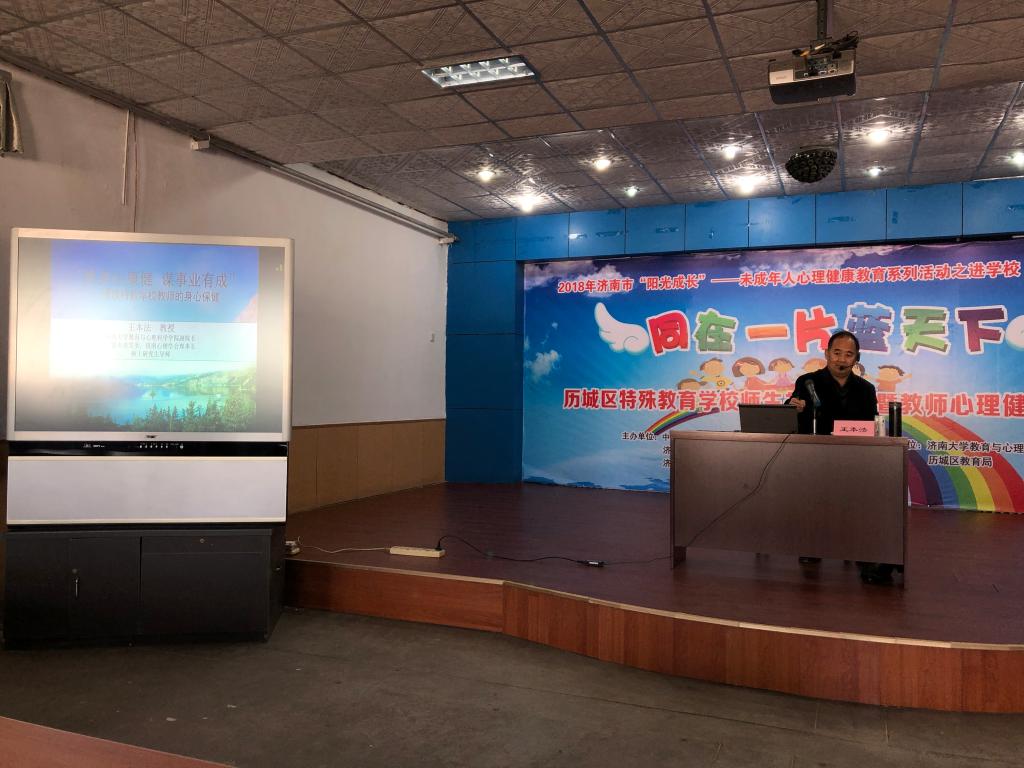 12月7日下午,由中共济南市委宣传部、济南市精神文明建设委员会办公室与济南市教育局联合主办,由威尼斯9499登录入口威尼斯9499登录入口和历城教育局联合承办的2018年济南市“阳光成长”——未成年人心理健康教育系列活动进学校之“同在一片蓝天下——历城区特殊教育学校师生关爱活动暨教师心理健康报告会”在历城特殊教育学校报告厅举行。历城特殊教育学校校长曾庆建及全体教师、威尼斯9499登录入口威尼斯9499登录入口特殊教育系胡金萍老师和研究生共40余人参加了报告会,历城特殊教育学校副校长吕仁祯主持了报告会。