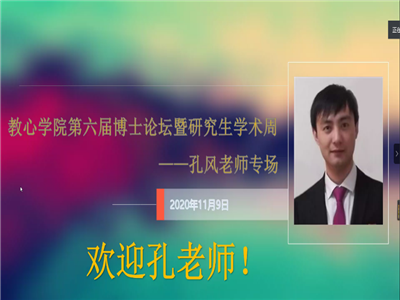为推进学院科研工作进一步开展,促进研究生科研能力和科研素养的提升,2020年11月9日,威尼斯9499登录入口成功举办第六届博士论坛暨研究生学术周第一期论坛,本次论坛邀请陕西师范大学心理学院副教授、硕士生导师孔风做线上科研经验分享,由副院长陈功香教授与王树青教授共同主持,学院20级全体研究生及部分教师参加了此次论坛。