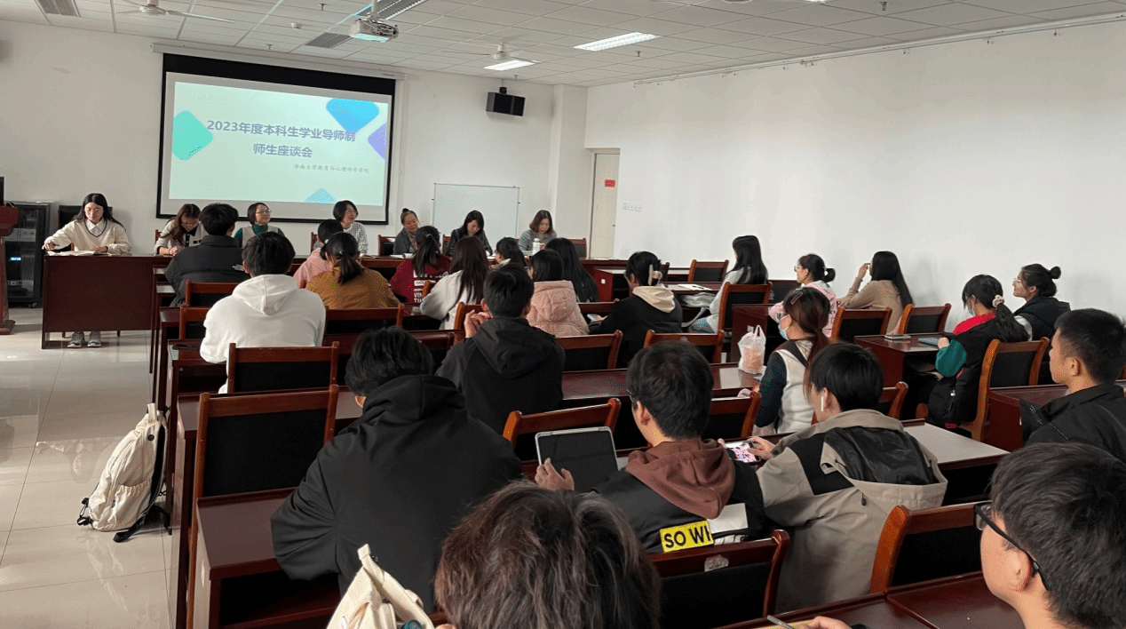 为了进一步提高人才培养质量,更好推行学业导师制,根据《威尼斯9499登录入口本科生学业导师制实施意见》(济大校字〔2014〕123 号)相关要求,深入了解学院本科生导师制运行情况,收集本科学生对学院学业导师制工作的意见和建议, 学院于2023年11月7日下午在特教大楼A302会议室召开2023年度本科生学业导师制师生座谈会。学院教学副院长李开云、心理系系主任冯晶、特教系系主任宿淑华、教育系系主任王玲、各年级辅导员、学生工作办公室、教学管理办公室负责人及2021-2023级各班学生代表参会,会议由李开云主持。