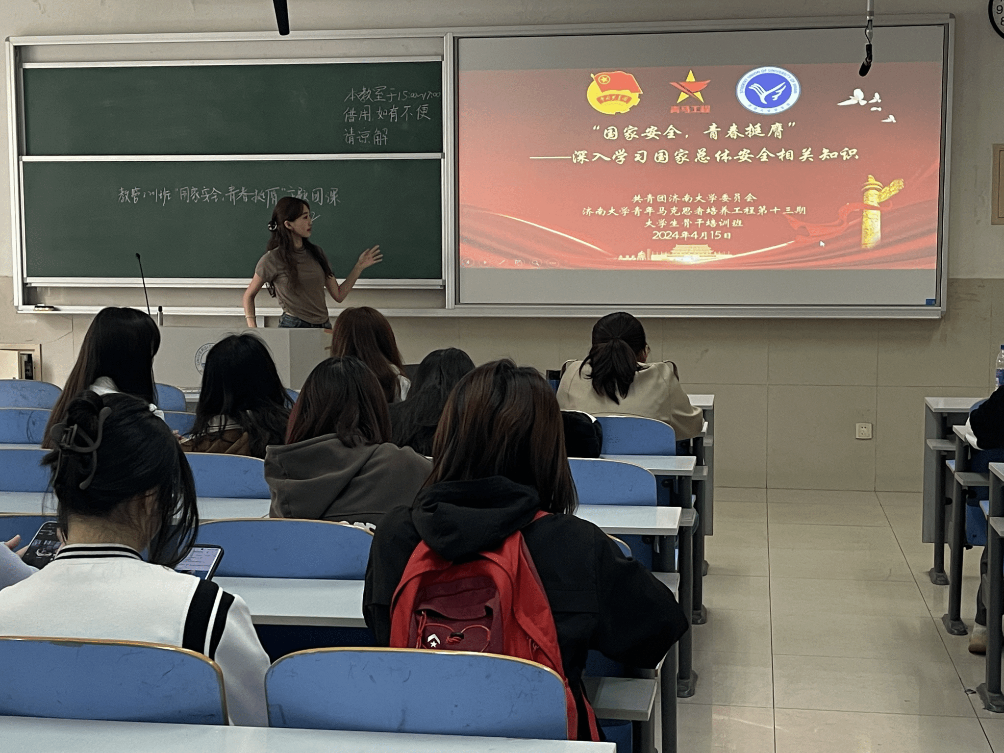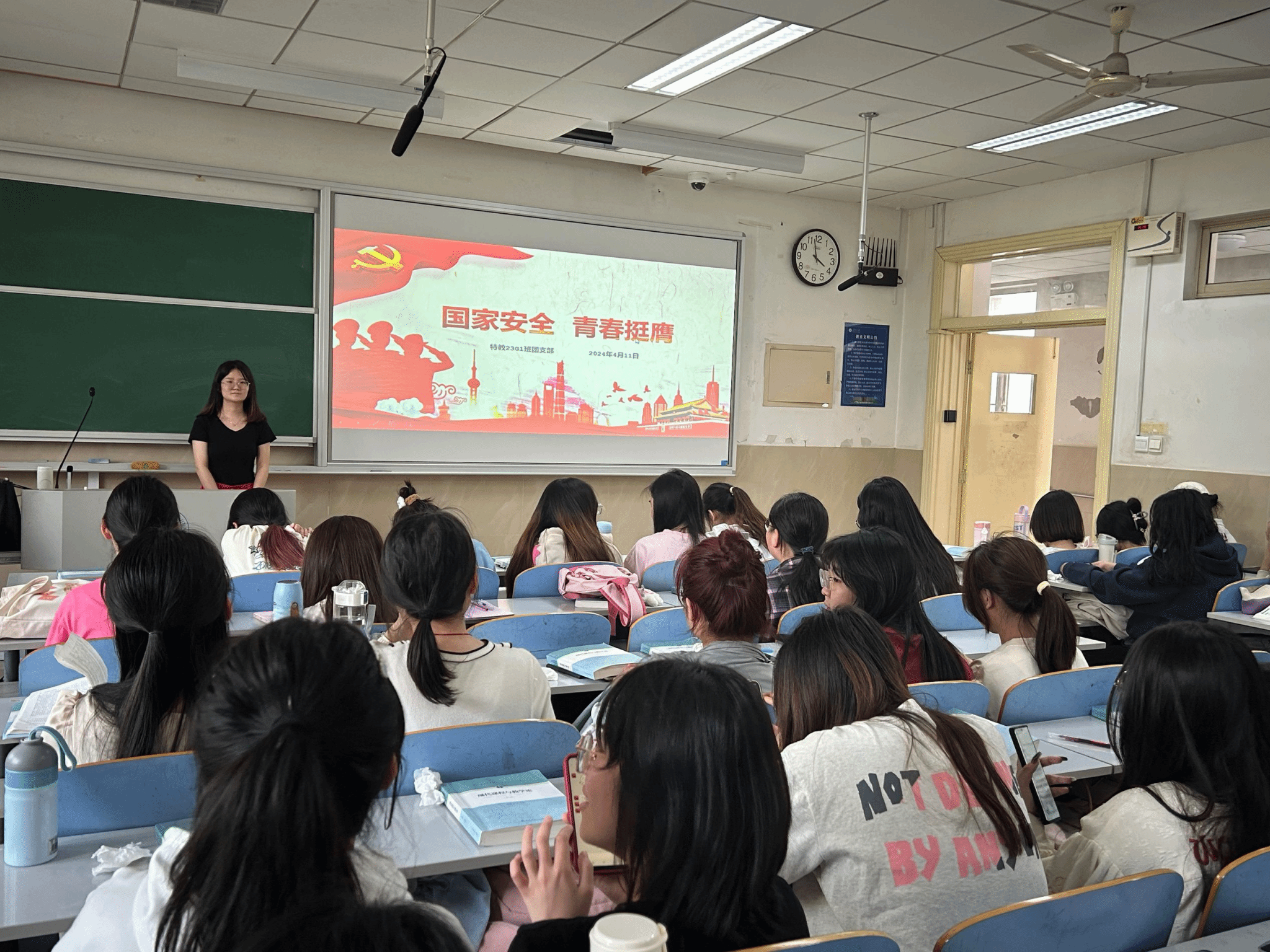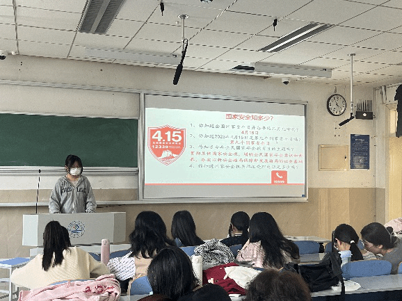 此次活动分为团委活动与班级活动两部分。在团委活动中,刘晓彤老师作为主讲人,提出“青年大学生应坚持国家安全至上”的理念,通过解释理论观念、普及国家知识、提高防范意识等环节让同学们意识到维护国家安全的迫切性。同学们认真思考,就国家安全问题展开了激烈讨论。随后各团支部开展系列活动进行学习。“学讲话·悟思想“,学生宣讲团对国家安全知识展开宣讲,从总体国家安全观的历史背景、主要内容开展讲解,加深了同学们对国家安全的总体认识;“学解析·践行动“,各团支部通过模拟演练、互动问答等形式将理论与实践相结合,引导学生自觉履行维护国家安全的责任与义务;“学案例·守底线”,学院团委组织同学们观看了国家安全警示案例的相关视频,从真实案例中学习,鼓励学生厚植爱国情怀,汲取奋进力量。