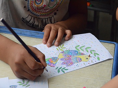 本次绘画课的主题是创意涂色。志愿者们给每个孩子都准备了两张相同的还没有上色的图案卡纸。在进行第一次涂色时,孩子们被告知按照自己的认知规规矩矩地上色,结果孩子们的作品果然千篇一律:灰色的小鸟,红红的花朵,彩铅只用了几根。在进行第二次的涂色时,志愿者让孩子们尽情地去发挥自己的想象力,涂抹出他们心中独一无二的作品。于是,世界变得多彩了起来,宛若开屏孔雀尾羽般的颜色荡漾在志愿者们的眼前。尽管每一幅画的轮廓都相同,但不同的色彩给每一幅画都注入了不同的灵魂。创作完成后,孩子们高举着卡片,介绍着各自的想法,描绘着属于自己的理想国。简单的涂色游戏,简单的几根画笔,志愿者们打开了孩子心中五彩斑斓的世界。