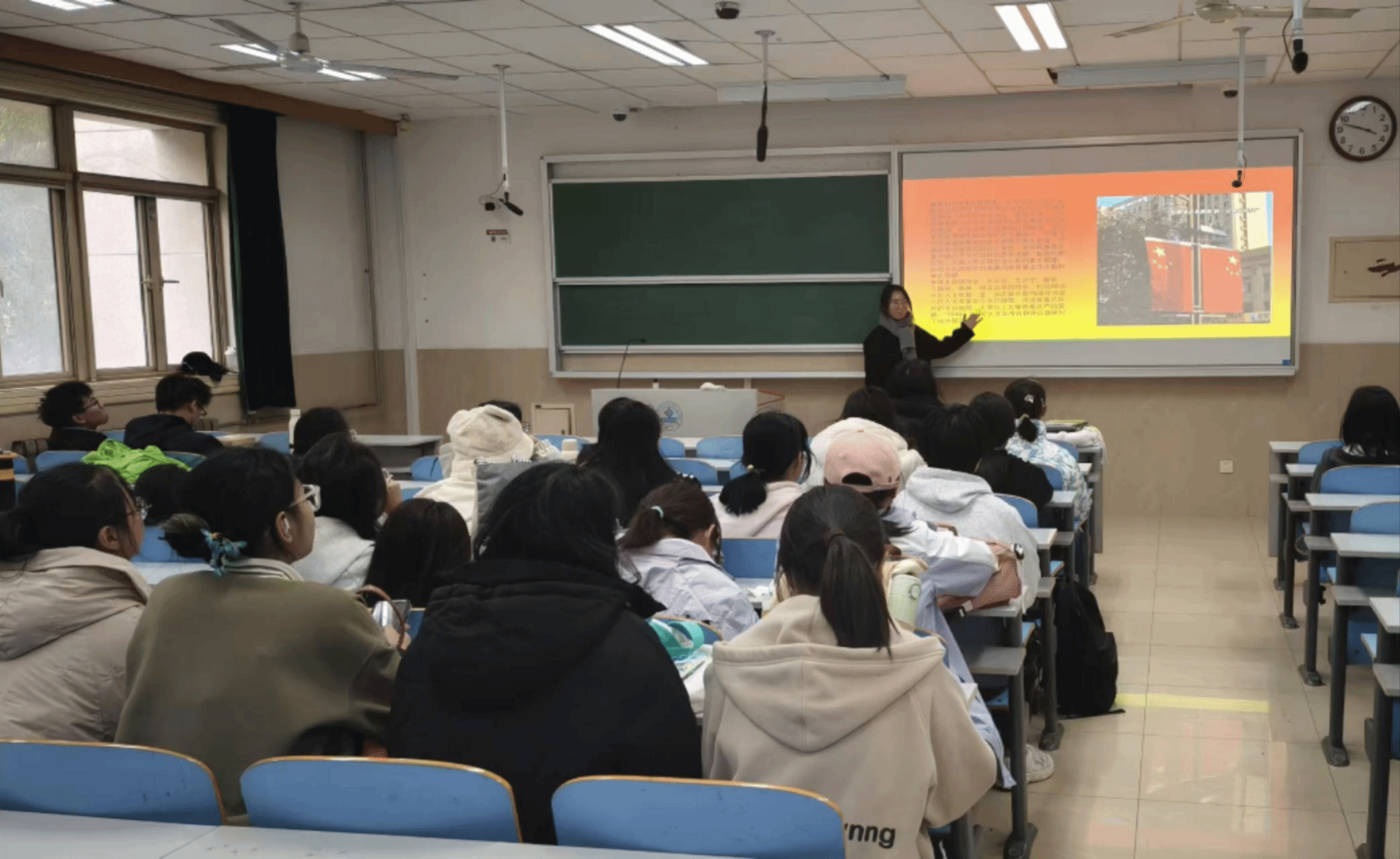 此活动分为学院团委和团支部两部分。在学院团委活动中,学院团委开展了“辉煌七十五载,共谱时代华章——庆祝中华人民共和国成立75周年 ”主题讲座活动。主讲人刘晓彤老师紧扣新中国成立75周年以来的伟大历程和璀璨成就,强调了坚定理想信念的重要性,并带领同学们系统性的回顾了新中国成立以来诸多历史性的关键节点,让学生进一步了解国家的发展格局。刘老师鼓励学生以家国情怀为出发点,思考自身努力方向同国家前进方向的一致性,深入剖析自身发展潜力,激励学生接过历史接力棒,为实现中华民族伟大复兴奉献青春才智。